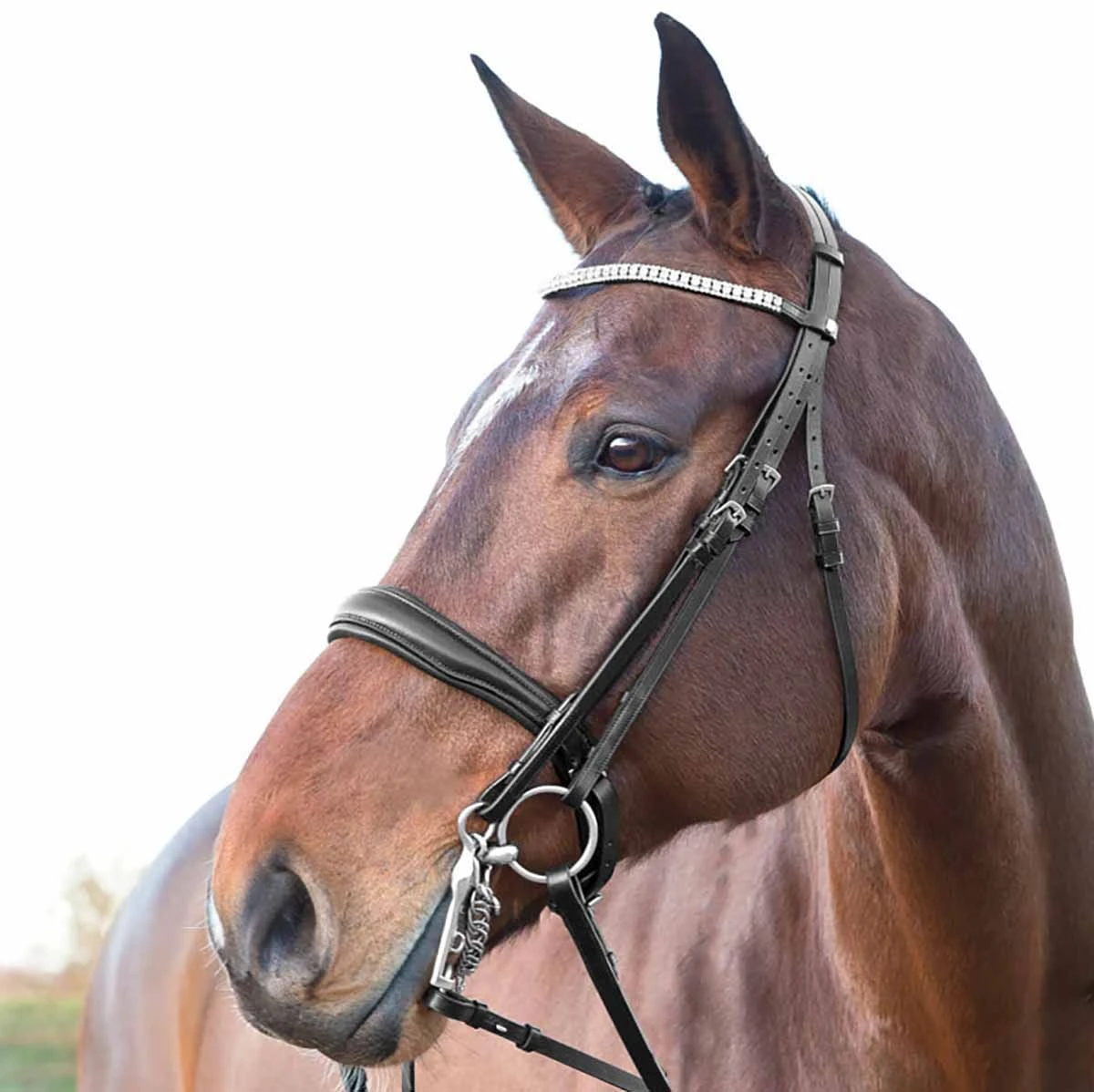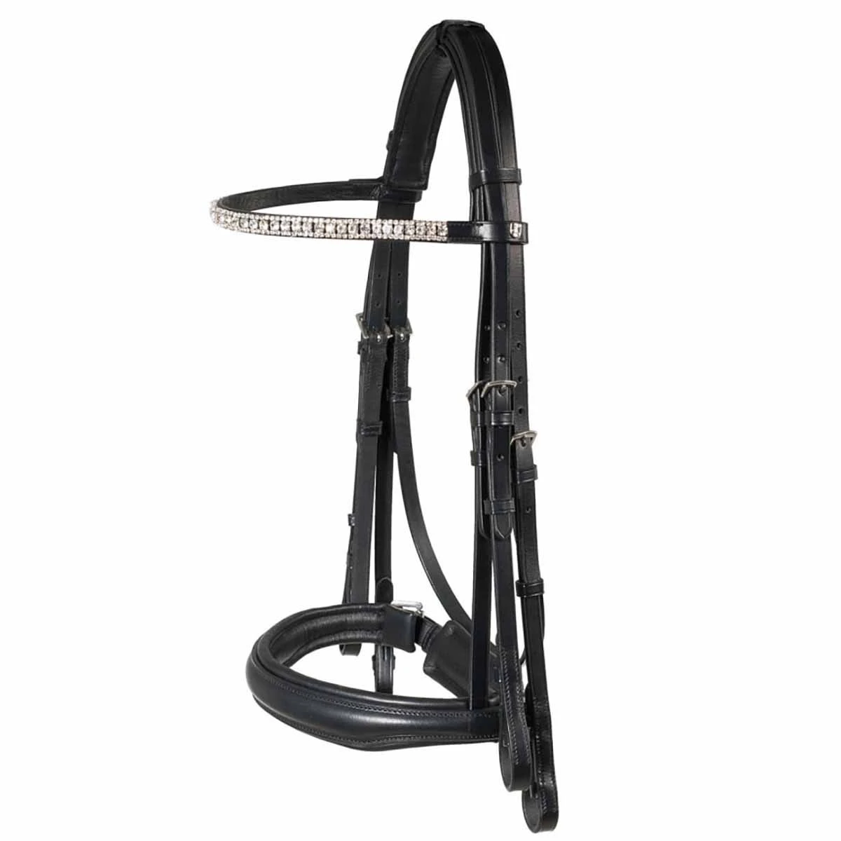 Horze Laelia Weymouth Dressage Bridle is a classic double bridle style with some modern updates. This double bridle features an ergonomic, shaped and padded crank cavesson, padding at the crown, and an eye-catching bling browband with a row of large inset crystals bordered by smaller crystals. Made from premium leather the Horze Laelia Weymouth Dressage Bridle will have your horse looking their best at home and in the show ring.