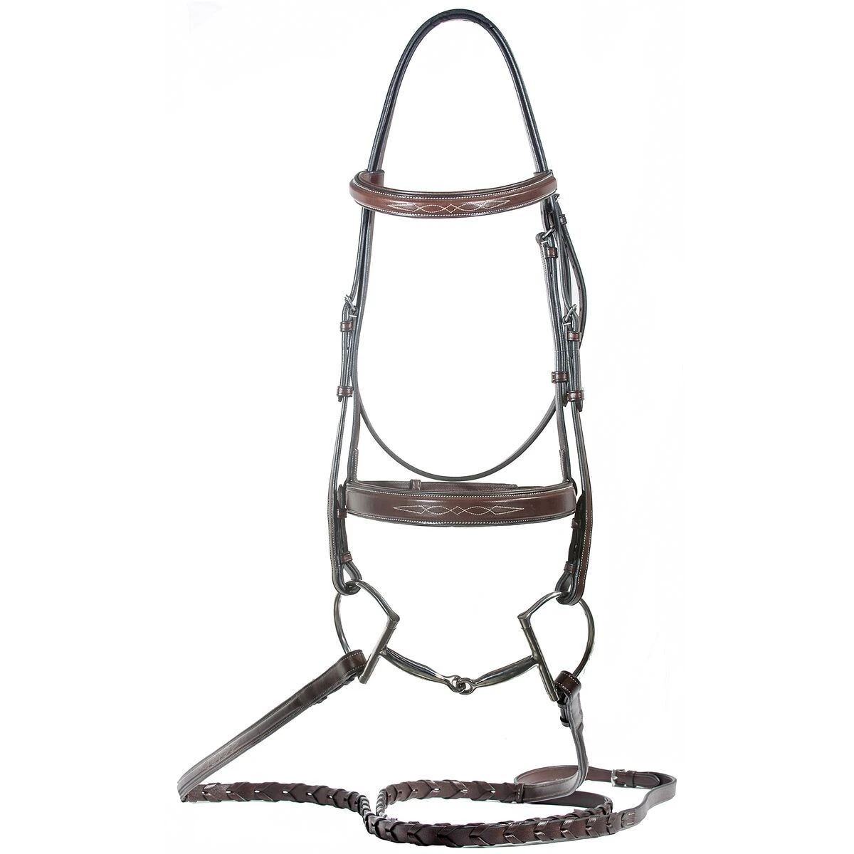The Nunn Finer Caterina Hunter Bridle combines a modern wide noseband with old world craftsmanship to make this popular hunter bridle. Flat raised browband and noseband, accented with fancy stitching.