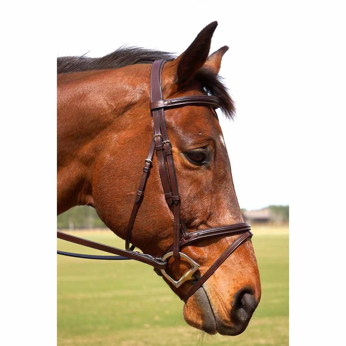 The Nunn Finer Victoria Flash Bridle with Patent Leather is crafted from beautiful, supple Italian leather and accented with Patent Leather on the browband and noseband. Fine stitching and 5/8 inch cheek pieces. This bridle is stylish, with extremely soft padding and a throat latch that adjusts on either side.