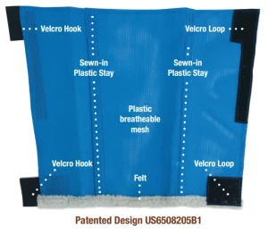 Breathable plastic mesh with sewn-in stays to eliminate sagging. Heavy-duty Velcro ensures durability and wear-ability. Lower edge finished in felt to eliminate embedded wild oats, burrs, and foxtails.