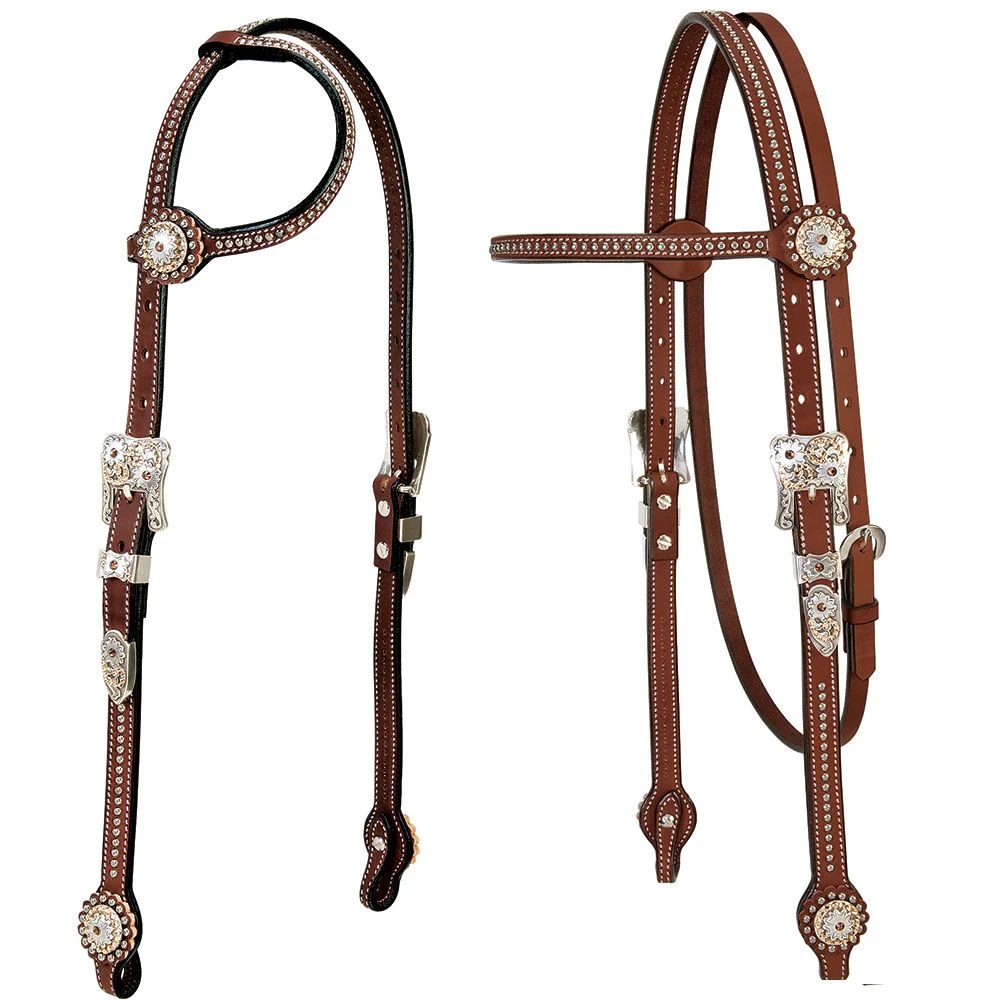 The Weaver Stacy Westfall Showtime Headstalls are high-end, handcrafted from rich brown premium English bridle leather. The addition of crystals will shine perfectly in the lights of the show ring. The smoothed and darkened leather edges coordinate perfectly with medium oiled saddles. The hardware includes etched nickle brass spots, antique sterling silver over zinc die cast conchos and buckle,loop, and tip sets with topaz crystals.Non-rust stainless steel buckle on throat latch.